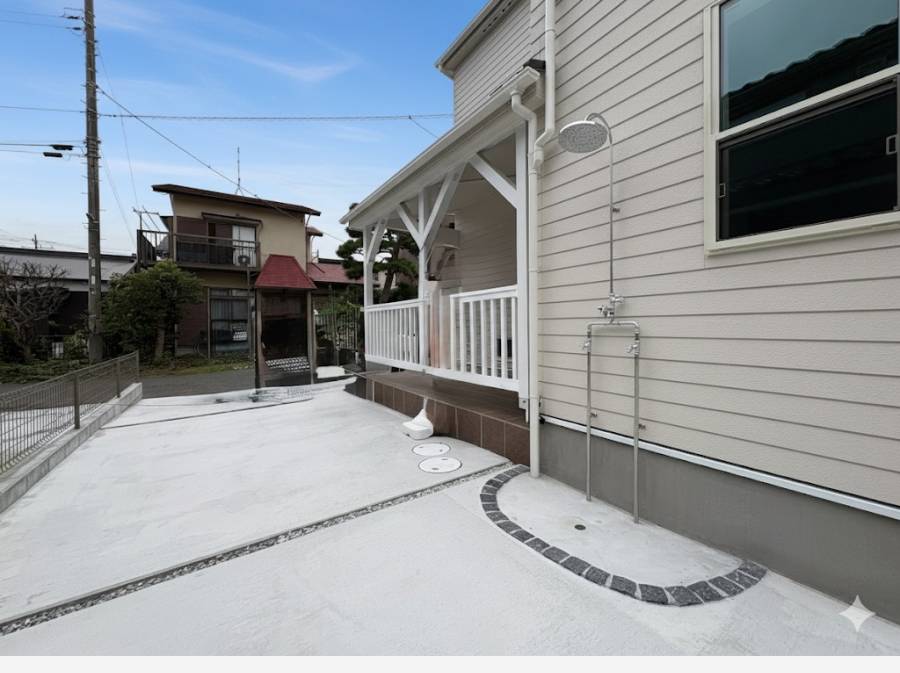 外観は、ホワイトのラップサイディングとカバードポーチが目を引く、開放的でリゾート感あふれる佇まい。
