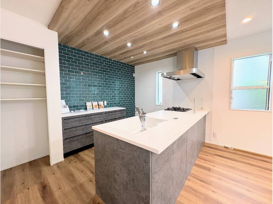内装は、タイル張りのキッチンをはじめ、明るくポップな要素を取り入れ、まるで海外の別荘にいるかのような気分を味わえます。