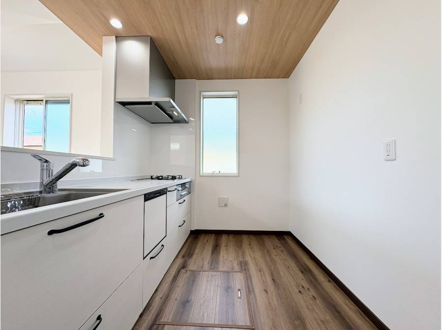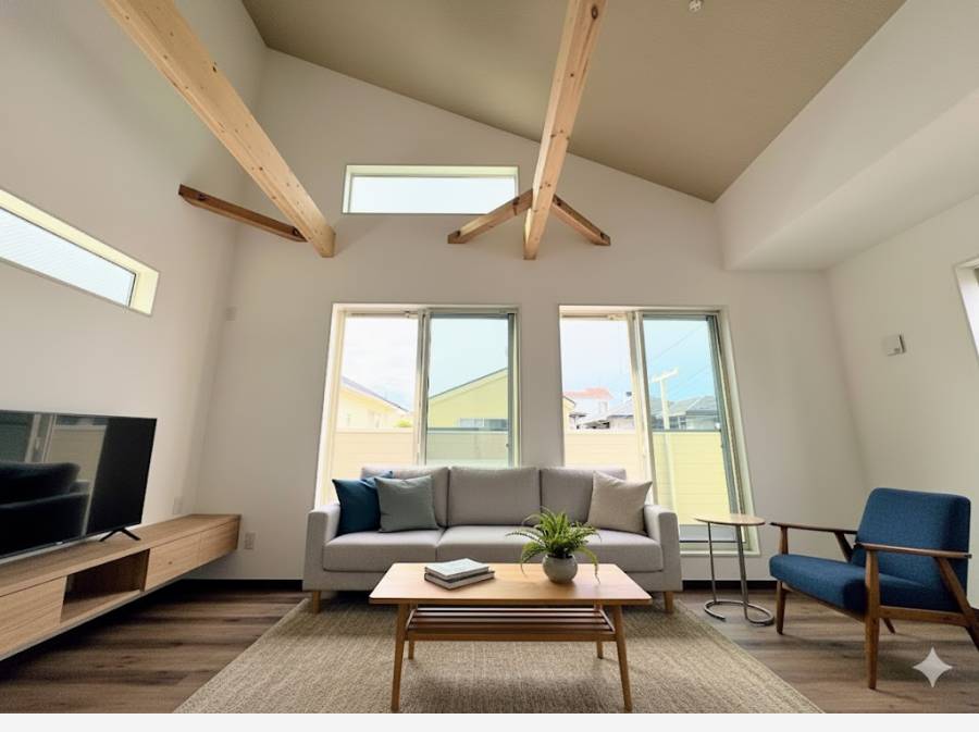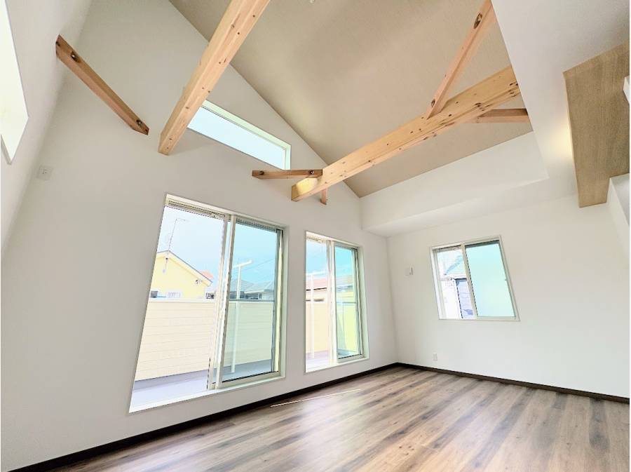 室内は、勾配天井を採用したLDKが中心。縦への広がりが開放感を演出し、明るくのびのびとした空間となっています。