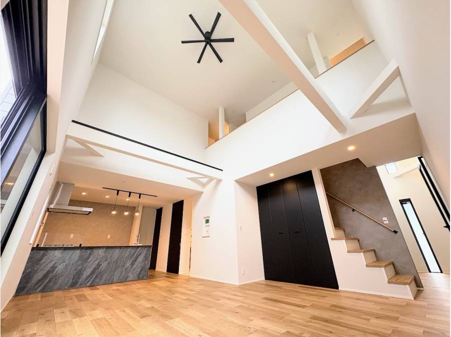 約21.5帖の広大なLDKは、吹き抜け構造により、縦への広がりも加わった開放感。明るく、のびのびと過ごせる家族の中心空間です。