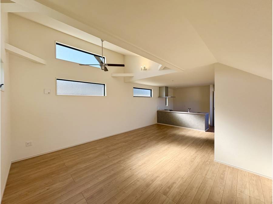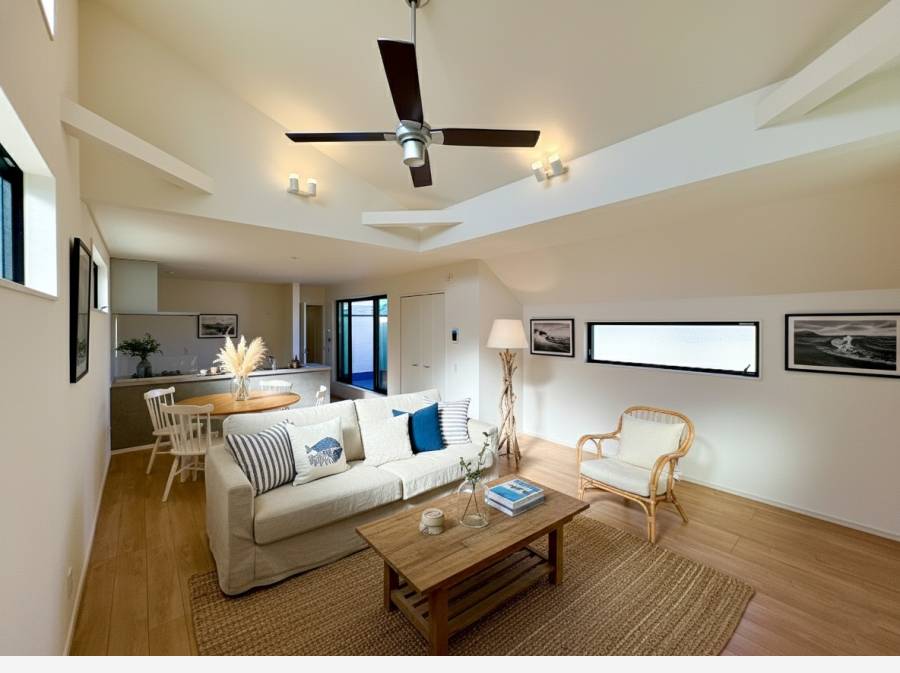 室内に入ると、約21帖の広々としたLDKが広がり、まず目を引きます。吹抜けの開放感とスタイリッシュなシーリングファンが、湘南らしいゆったりとした時間と心地よい風をもたらします。
