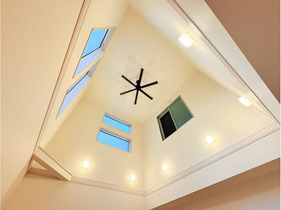 リビング上部には開放的な吹き抜けを採用し、天井ではシーリングファンがやわらかな風を届けます。