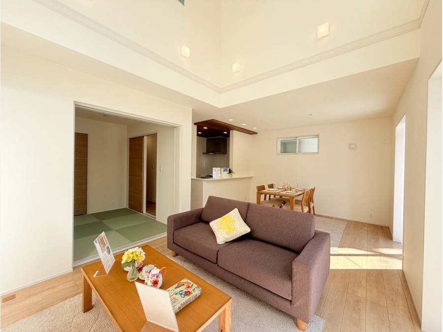 リビングは吹き抜けのある開放的な空間で、やわらかな光がふわっと差し込み家族が自然と集まる場所に。