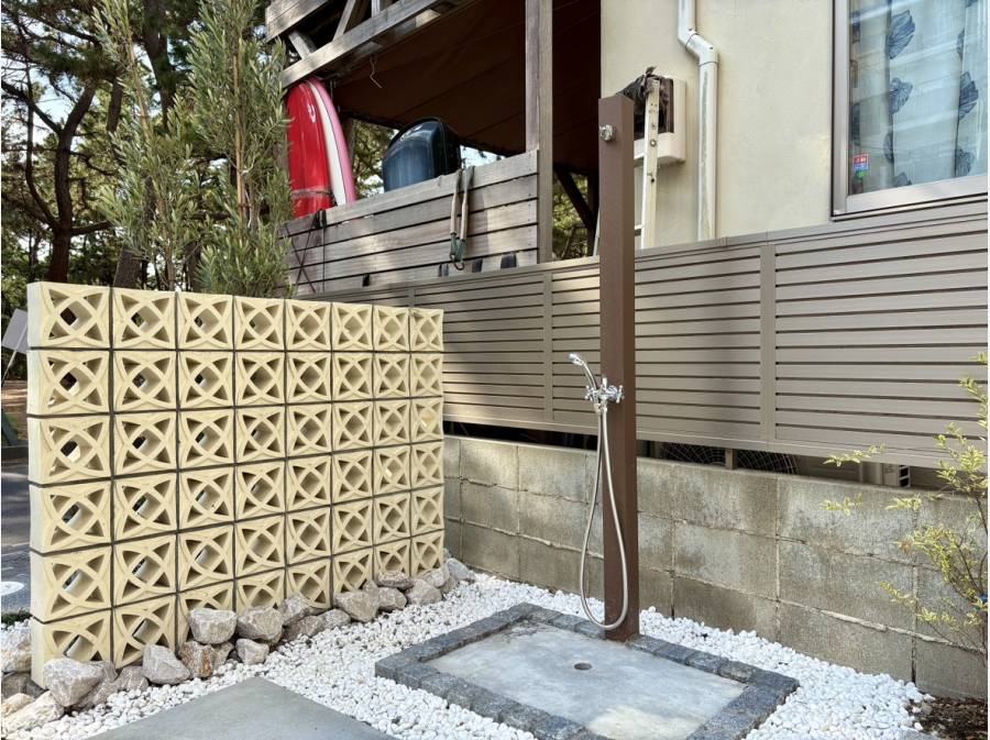 玄関近くには、サーフィンやアウトドア時間を過ごす方に便利な屋外シャワーもございます♪