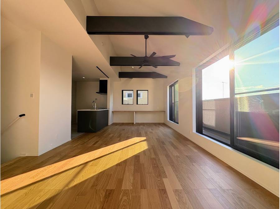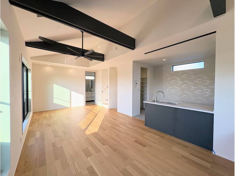 また、室内は約21帖のLDKが中心。勾配天井を採用しており、縦への広がりも感じられる広々とした空間となっています。家族がのびのびと過ごせる、明るいリビングです。