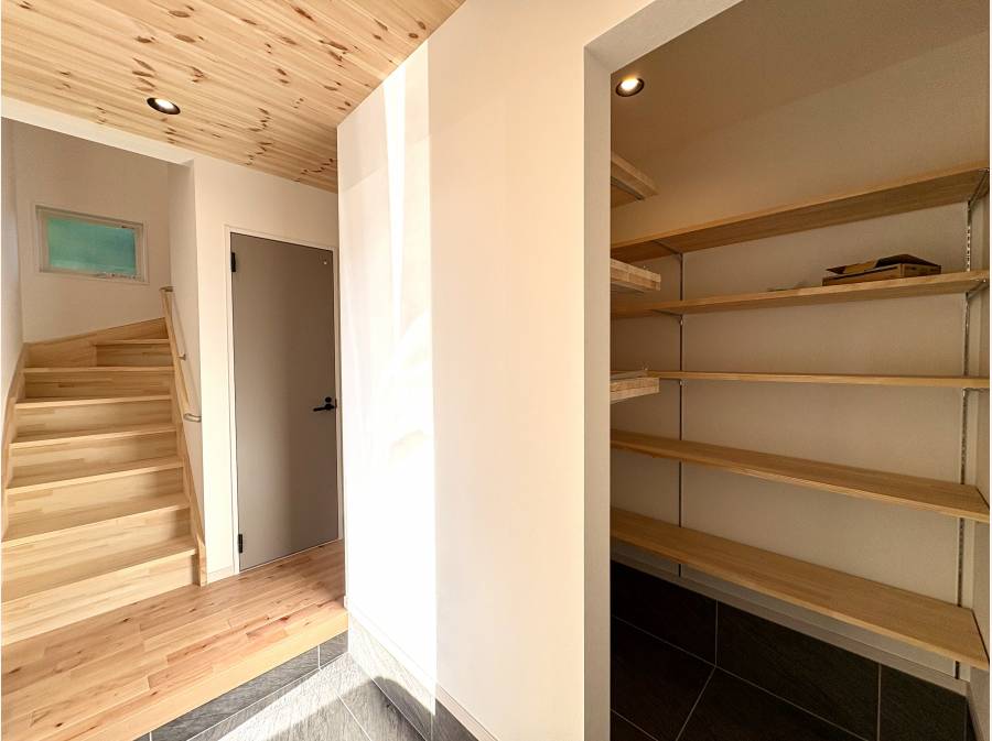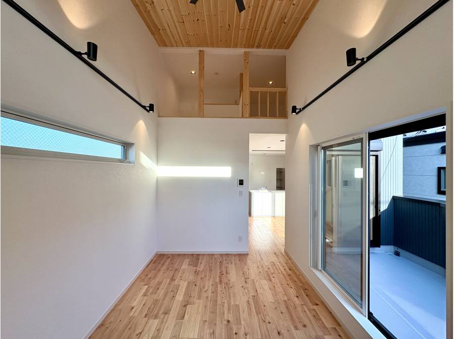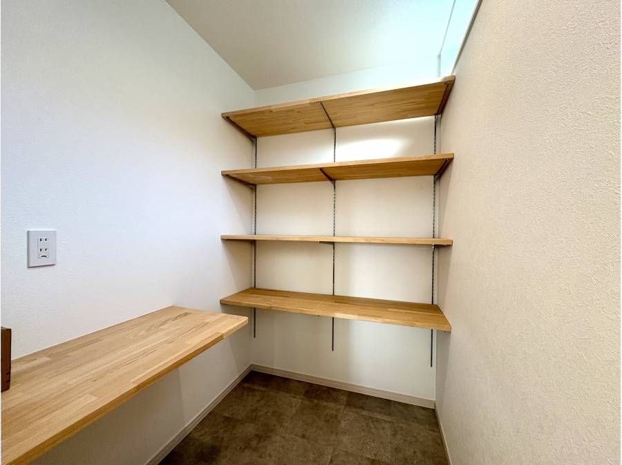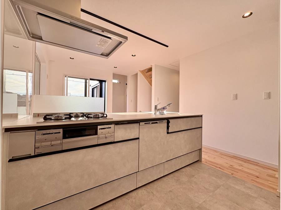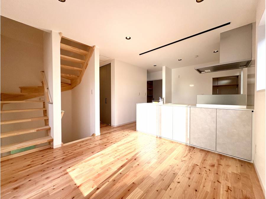 収納や趣味の部屋など、自由に使える空間が暮らしの可能性を広げます。ダイニング側には収納扉付きの対面キッチンを備え、すっきりと片付いた空間を保てます。