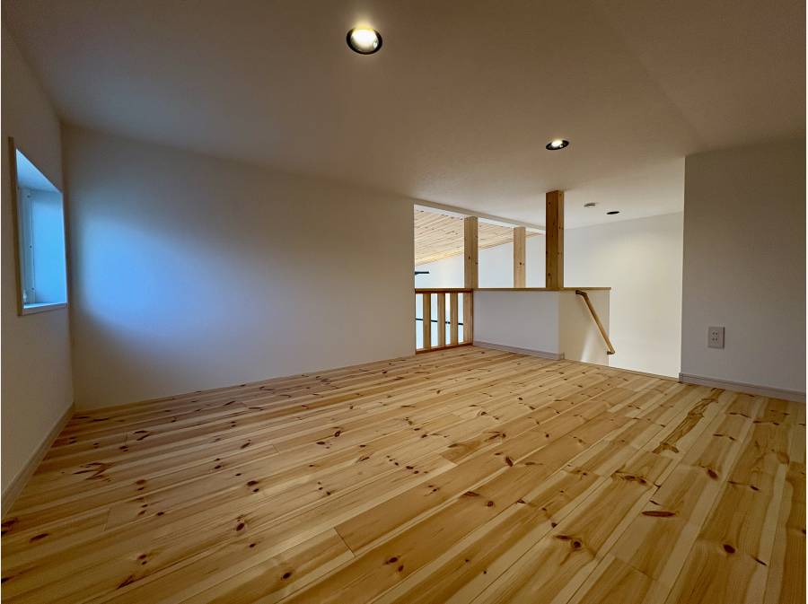 床には優しい風合いの「西南カバの無垢材」を、そして開放感を演出する勾配天井には「パインの板貼り」を贅沢に使用しました。