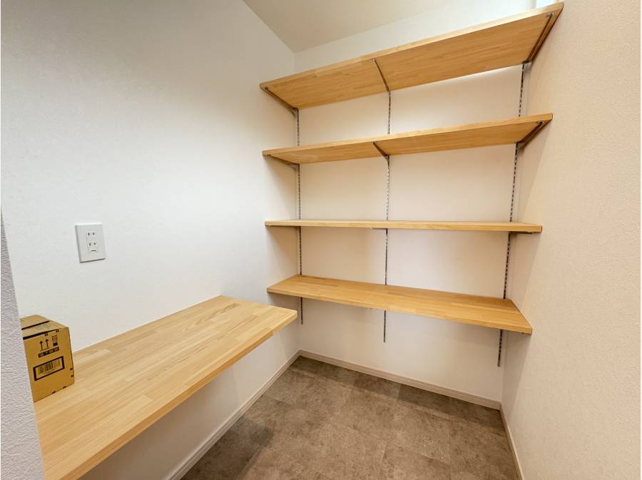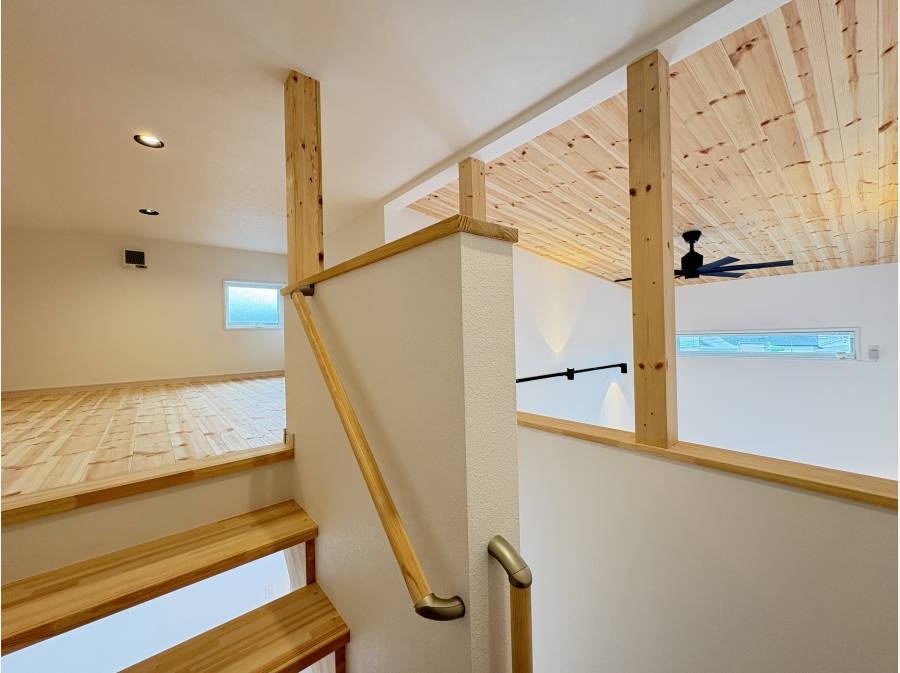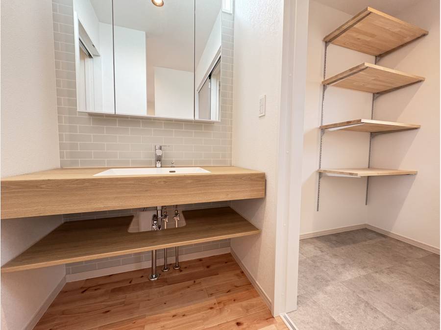 2階の約20帖のリビングは勾配天井のパイン板張り、造作のような洗面台、キッチン裏には大型のパントリーも付いております。