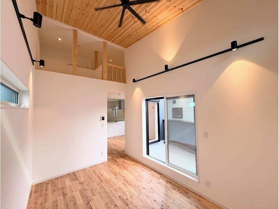 この物件の魅力はデザイナーズハウスならではの、こだわった外観と内装です。床には西南カバの無垢材を使用しており、勾配天井はパインの板貼りと木の温もりを感じながら生活することができます。