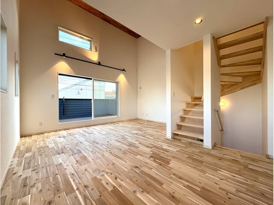 床には表情豊かなアカシアの無垢材を、リビングの勾配天井には同じくアカシアの板貼りを贅沢に使用しました。