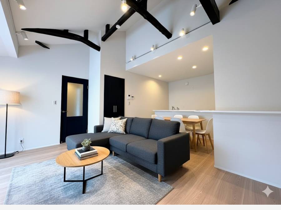 建物の梁や趣のある窓をあえて残すことで、ヴィンテージな風合いと新しい設備の機能性が融合した、唯一無二の雰囲気を生み出しています。木のぬくもりを感じながら、快適な現代の暮らしを両立できるデザインです。
