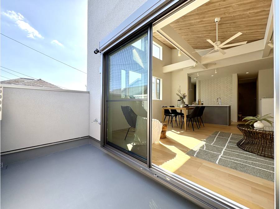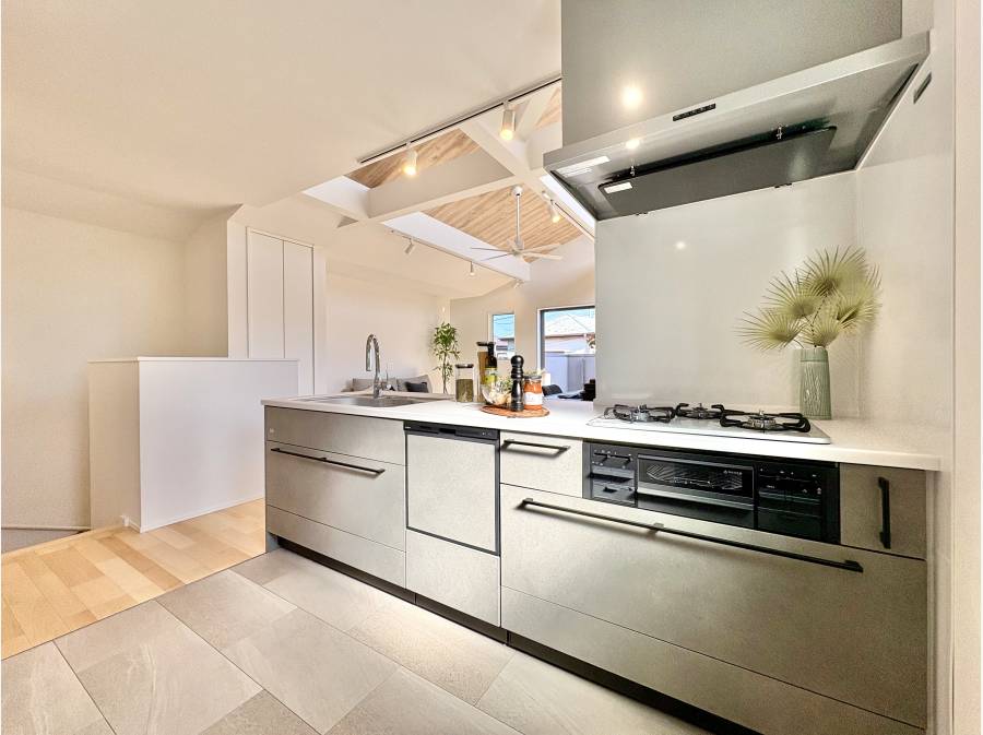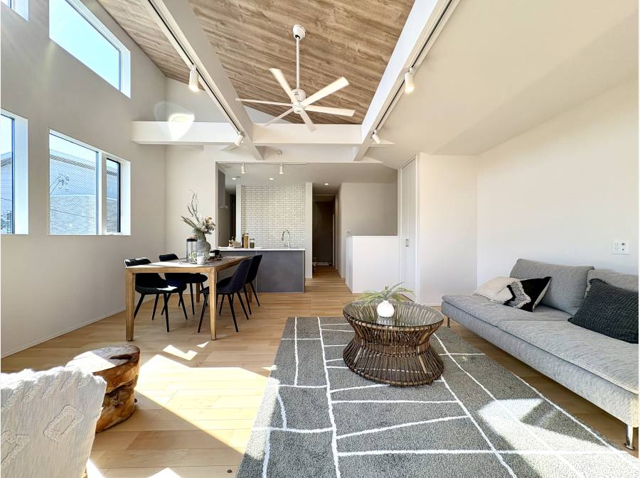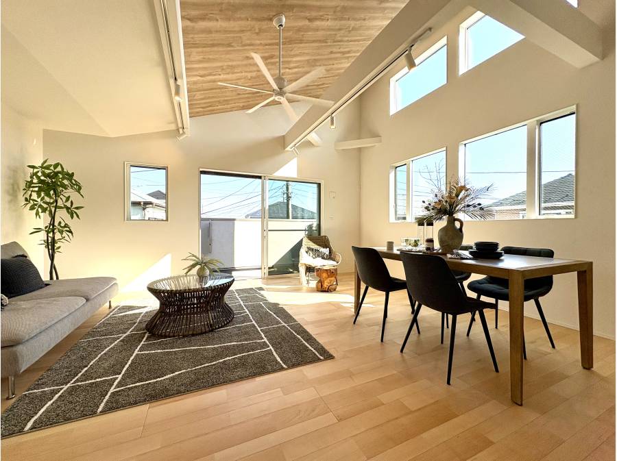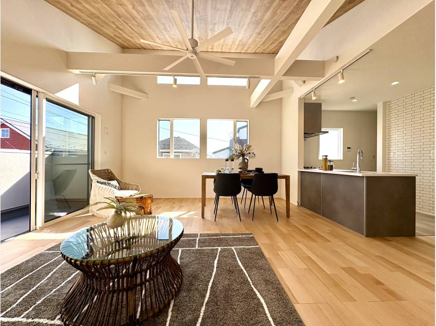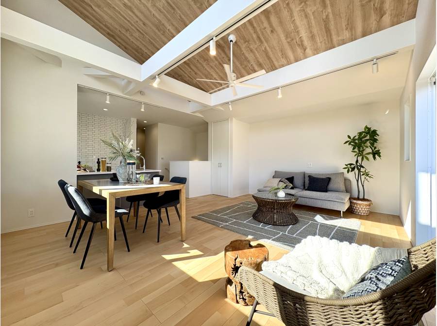 南向きの窓から光が差し込む空間は、開放感あふれる勾配天井となっており、家族の時間を豊かに彩ります。