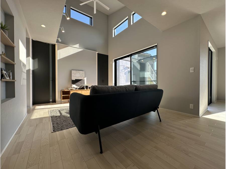 テラスが併設された約25帖のLDKは、上部吹抜けていて、勾配天井ですので、開放感に溢れてます