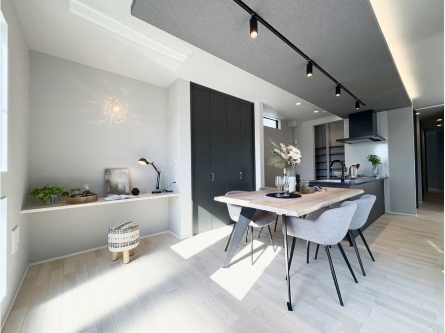 約25帖の開放感ある吹抜天井のLDKとリビングダイニングから続く大型テラスが明るく開放感のある室内空間を演出します。