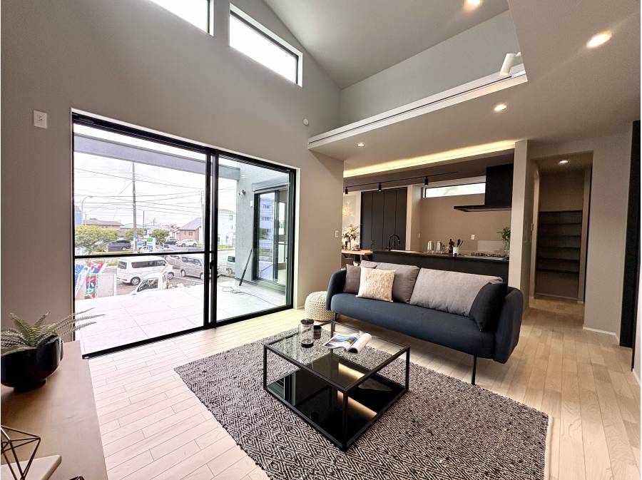 約25帖のLDKは勾配天井が生み出す圧倒的な開放感。