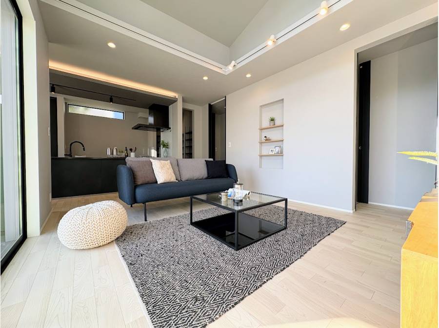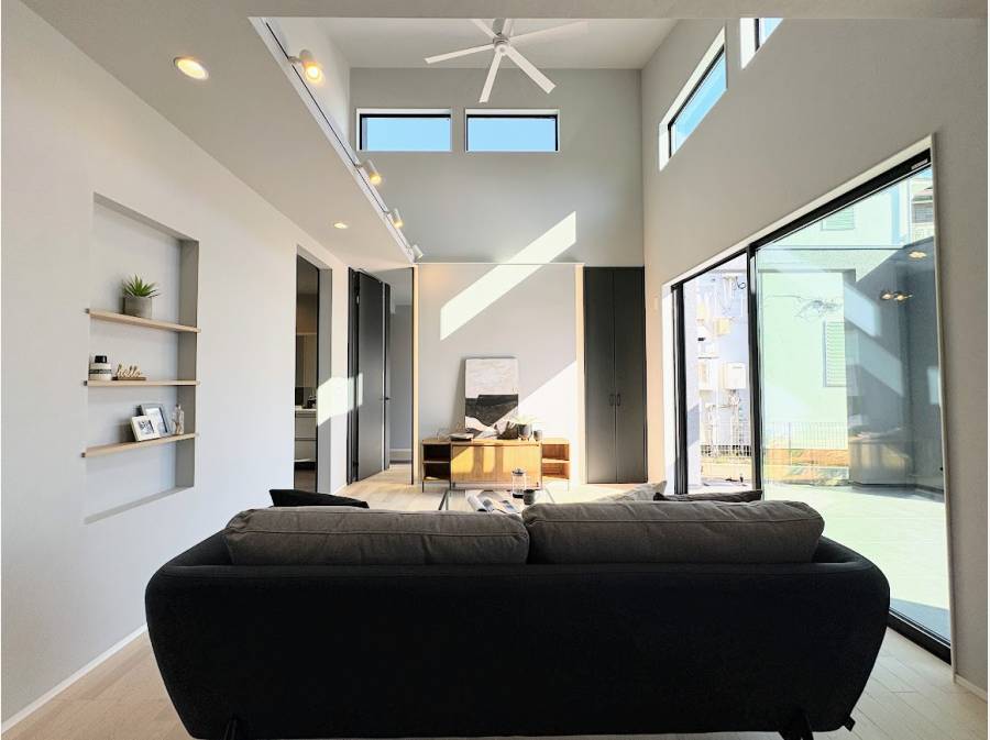 25帖の広大なLDKは、勾配天井と吹き抜け仕様。縦横に広がるダイナミックな空間で、家族がのびのびと過ごせます。