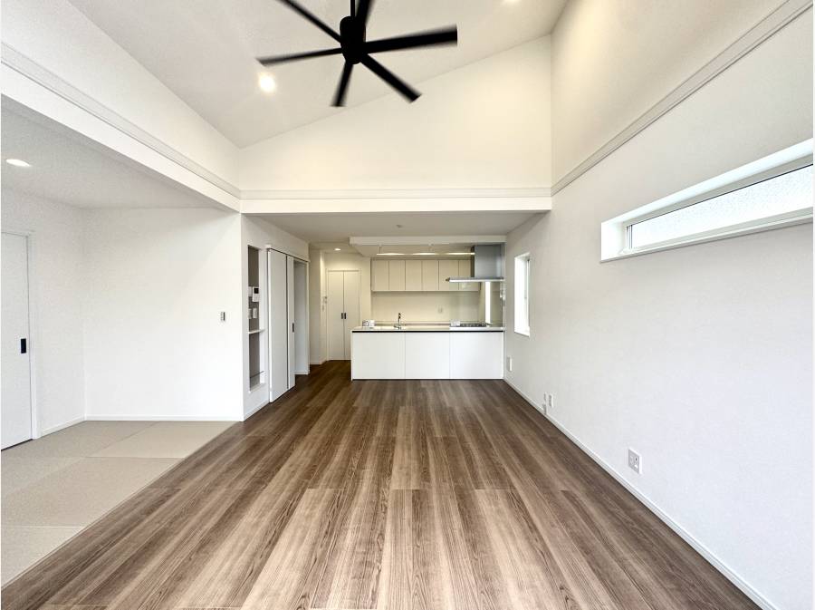 高い天井から光が降り注ぐ明るいリビングは家族の憩いの空間に