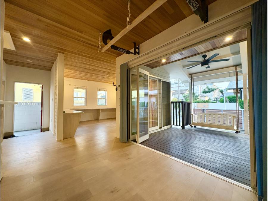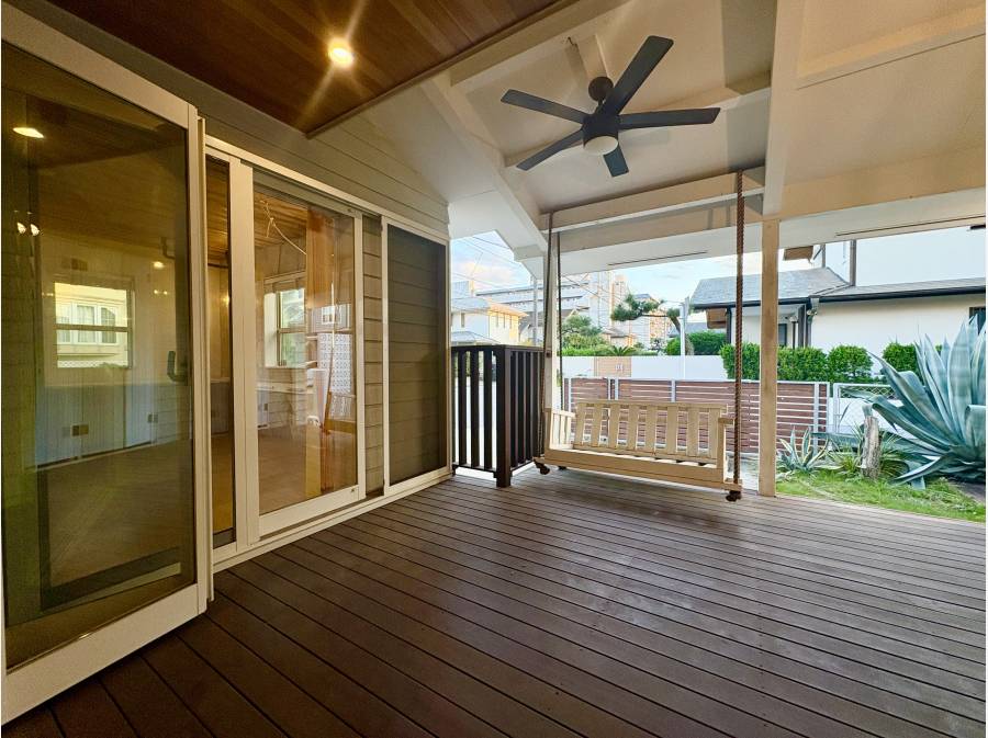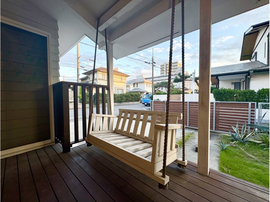 リビングからつながる8.3帖のカバードポーチにはブランコベンチが設置され、海風を感じる「ガーデンリビング」として楽しむことができます。