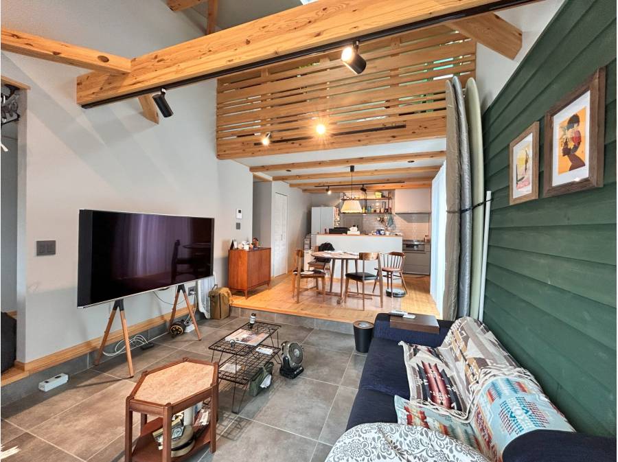 コンクリート仕上げのリビング土間が特徴的で、リビングと庭の一体感を感じられる設計です。趣味の道具を飾ったり、フレキシブルに使えるこの空間が、日々の暮らしに豊かな彩りを与えてくれます。