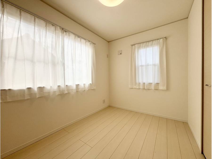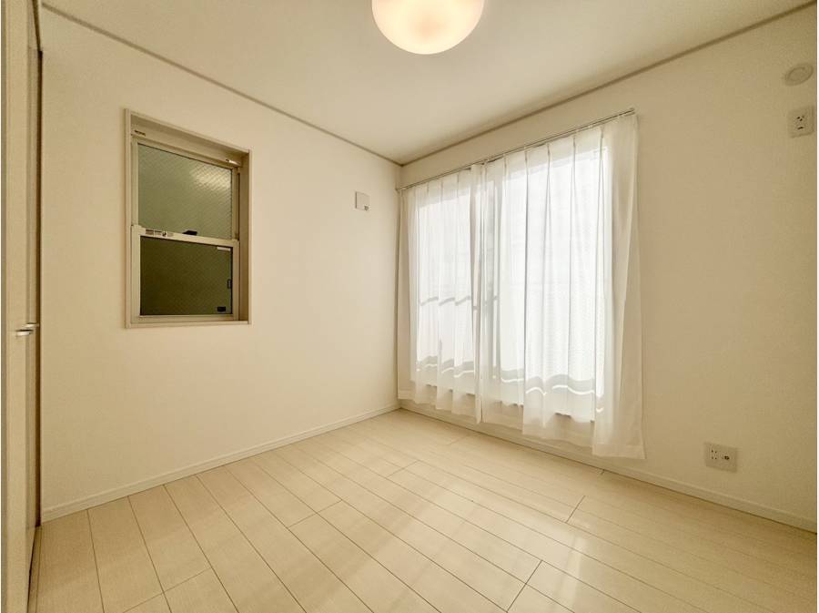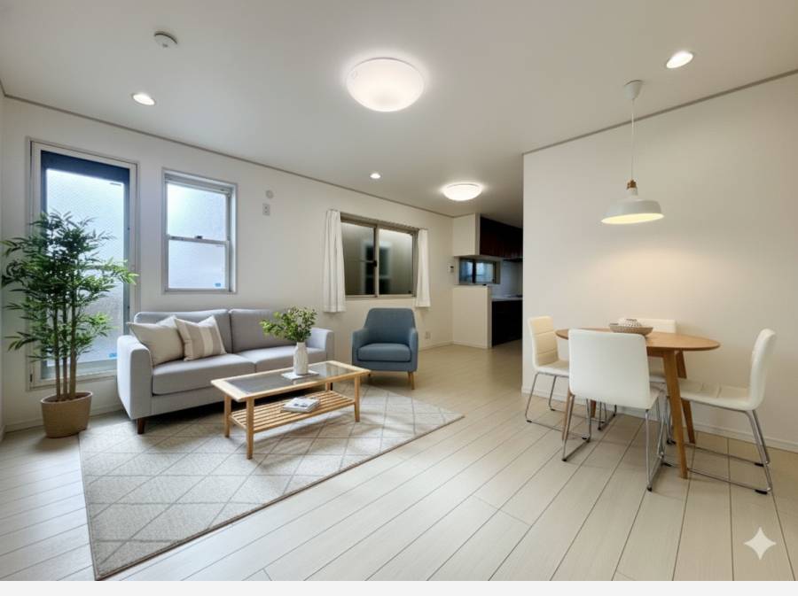 落ち着きある色調でまとめられた室内は、新規リノベーションによって美しく仕上がり、まっさらな空間で新生活を始められる一邸です。約16帖のLDKは、自然と家族が集まりたくなる伸びやかな広さに備え、家具の配置もしやすいシンプルな間取りが魅力。
