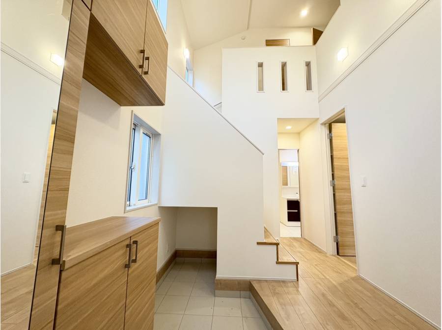 吹抜けの明るい玄関が迎えてくれる新築邸宅