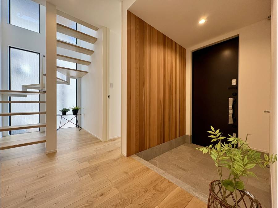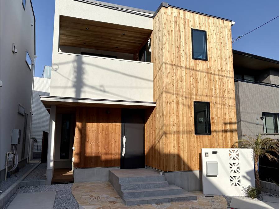 人気の「浜竹4丁目」エリア、開放感あふれる南道路に面した好立地に、自然素材の質感を活かした新築邸宅が誕生しました。