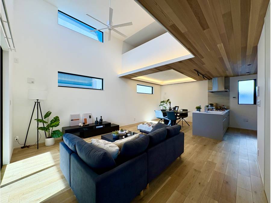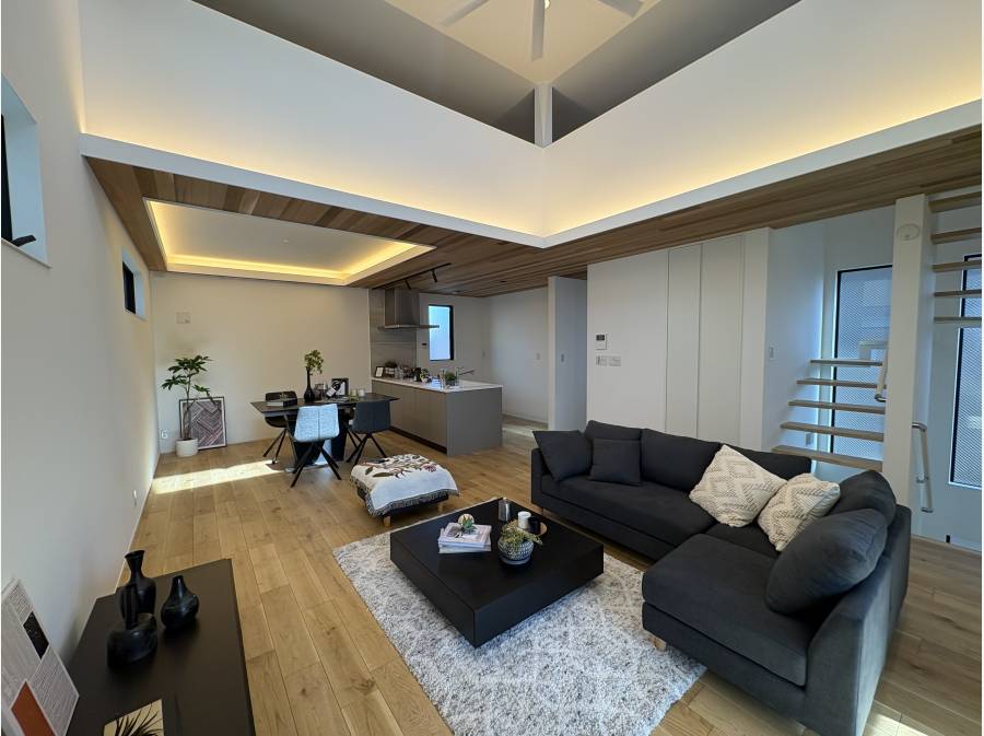 約22.5帖の広々としたLDKは、吹き抜け構造が生む開放感と間接照明が織りなす心地よい雰囲気が魅力。