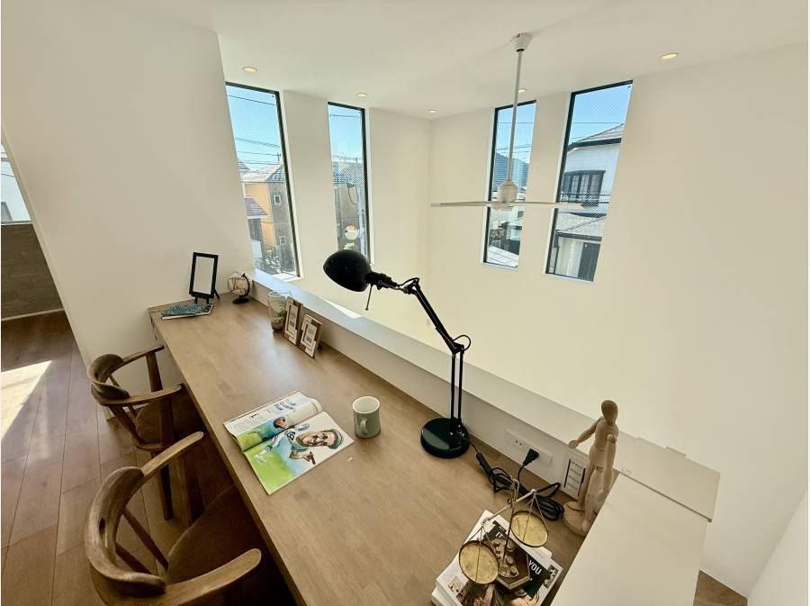 吹き抜けから入る光と、木の温もりを感じる天井デザインが、