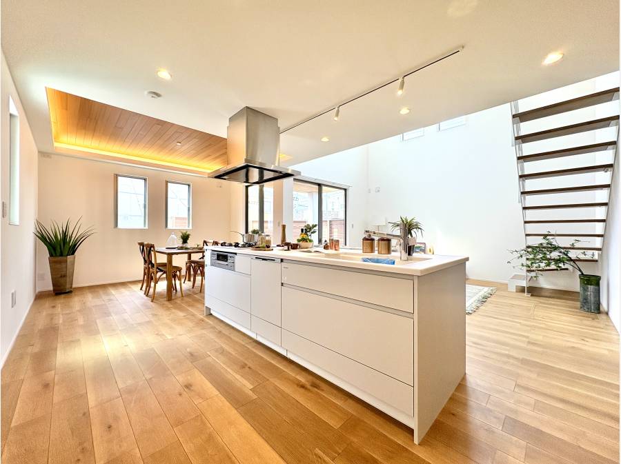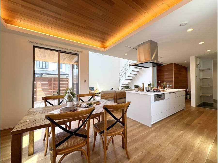 大型の吹き抜け天井と間接照明が開放的な空間を演出し、アイランドキッチンや天然木レッドシダーの折り上げ天井、天然の突板仕上げの床材が上質な心地よさをもたらします。
