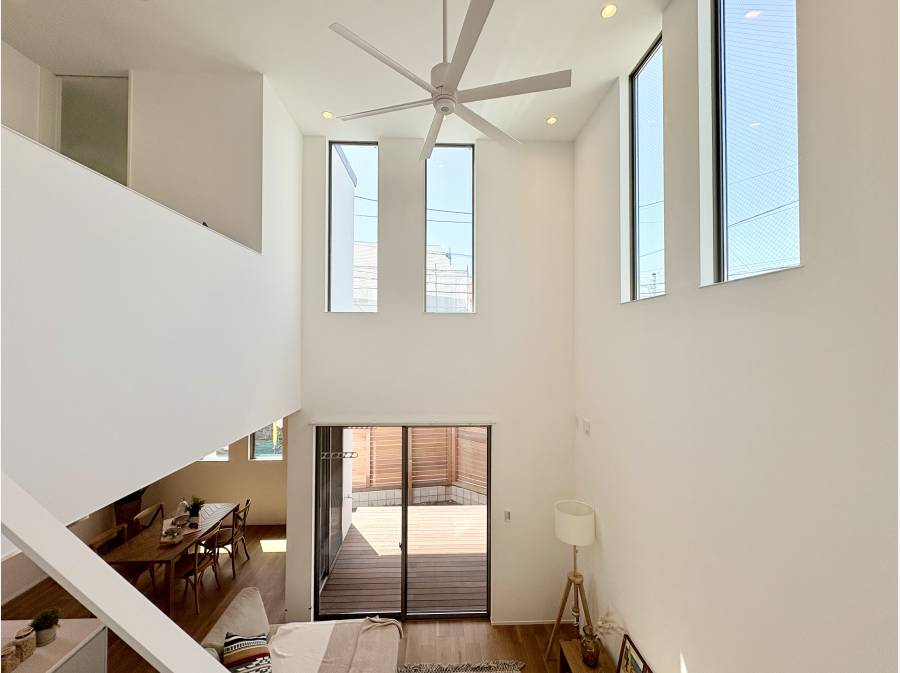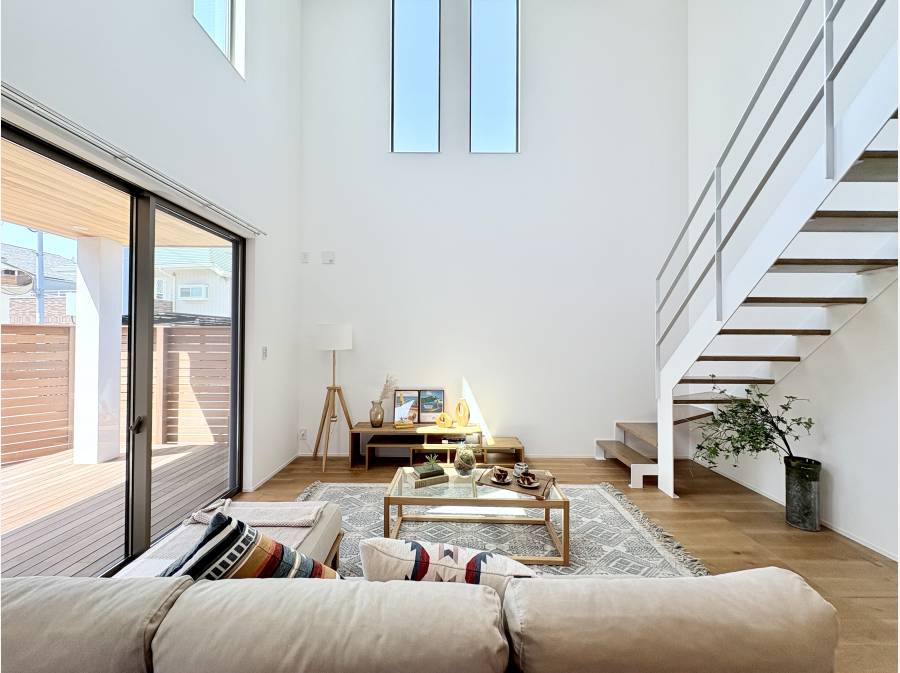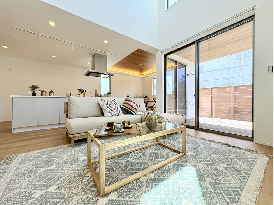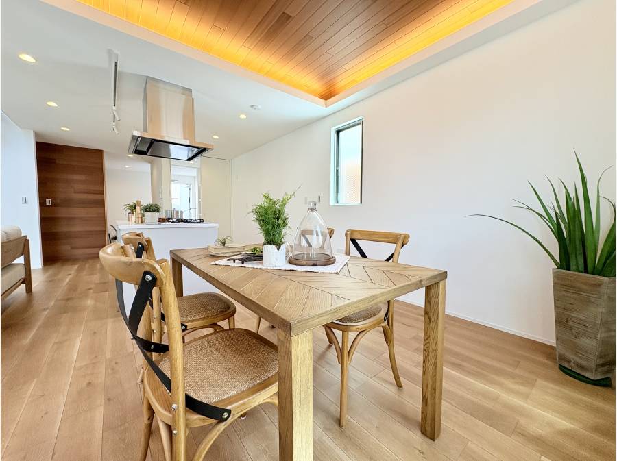 LDK約23帖のゆとりのある空間には、広い吹き抜けや、ダイニング上部の間接照明。庭には天然ウッドデッキを設けています。