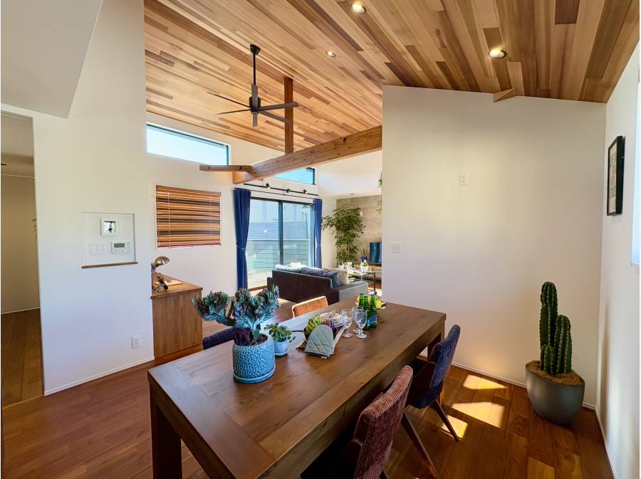 間取りは3LDKに加え、ウォークインクローゼットを備えています。LDKは勾配天井の23.5帖と広々とした空間が特徴で、玄関ホールやリビングダイニングの床には無垢チーク材を採用し、上質な雰囲気を醸し出しています。