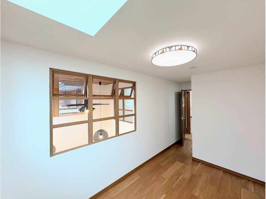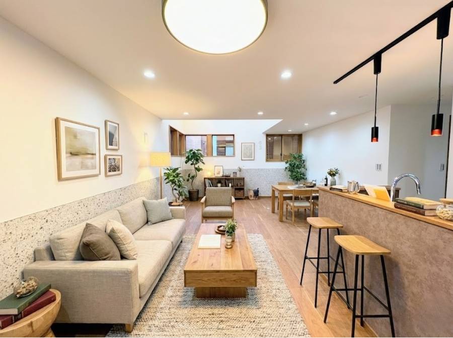 玄関を開けた瞬間から感じる、オーナー様のこだわり。 美しいキッチンから続くLDKは、光と風が通り抜ける開放的な空間です。見上げれば洋室のシーリングファンがゆっくりと回り、まるでリゾートのような心地よさを演出します。