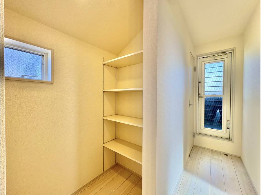 キッチンには可動棚付きのパントリーがあり、日用品や調味料をすっきり収納できるため、キッチン周りが片付きやすくなっています。
