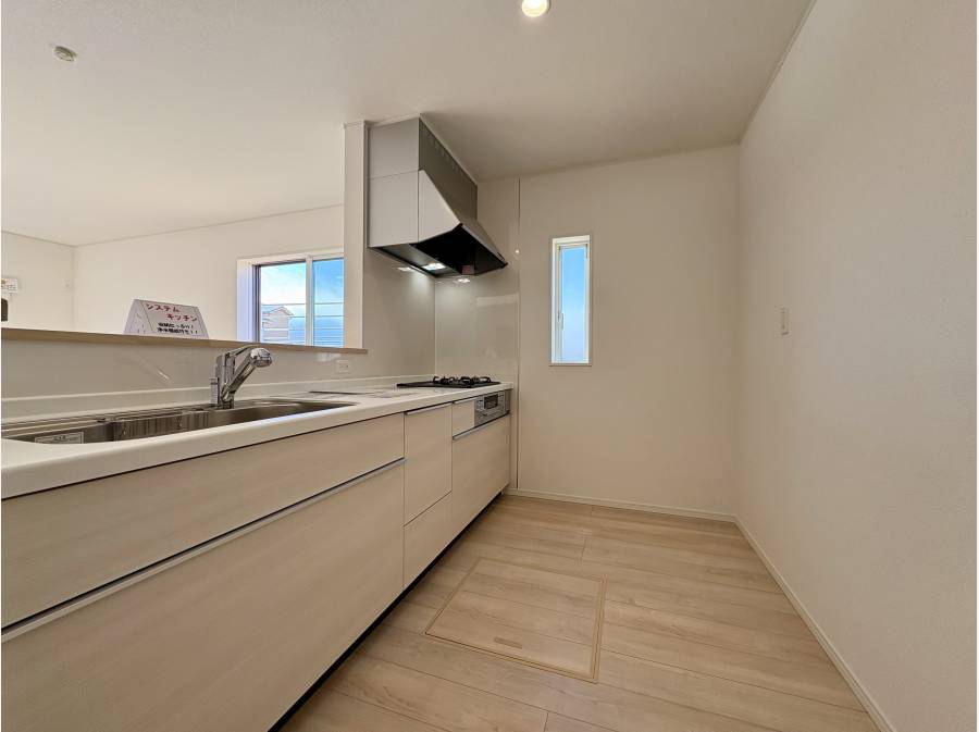 キッチンからリビングを見渡せる開放的な空間設計は、家族の会話を自然に弾ませます。