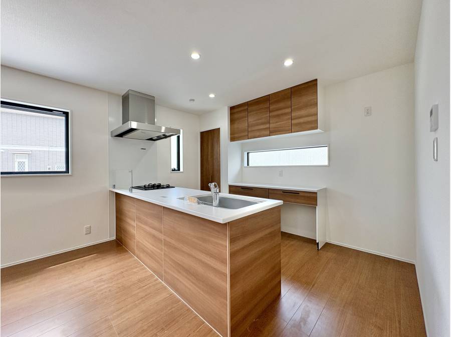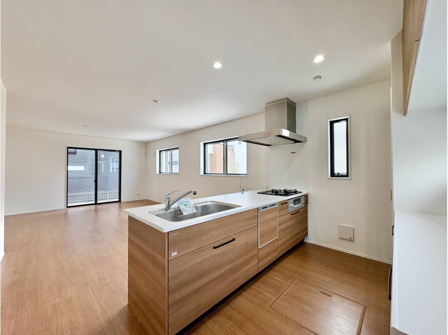 対面キッチンはリビングを見渡すことができ、そこで遊ぶ子供たちの姿がうかがえ安心です。