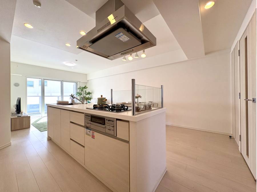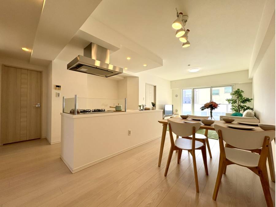 約17.4帖の広々としたLDKには、ダウンライトが柔らかな光を灯し、明るく清潔感のある空間を演出。
