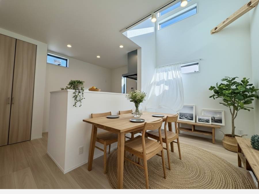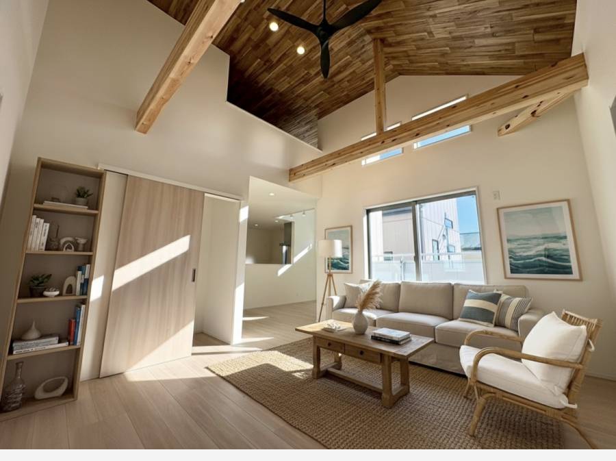木の温もりが包み込む、陽光あふれる邸宅。南西に広く面したリビングは勾配天井から差し込む光で満たされ、家族の時間をやさしく演出します。