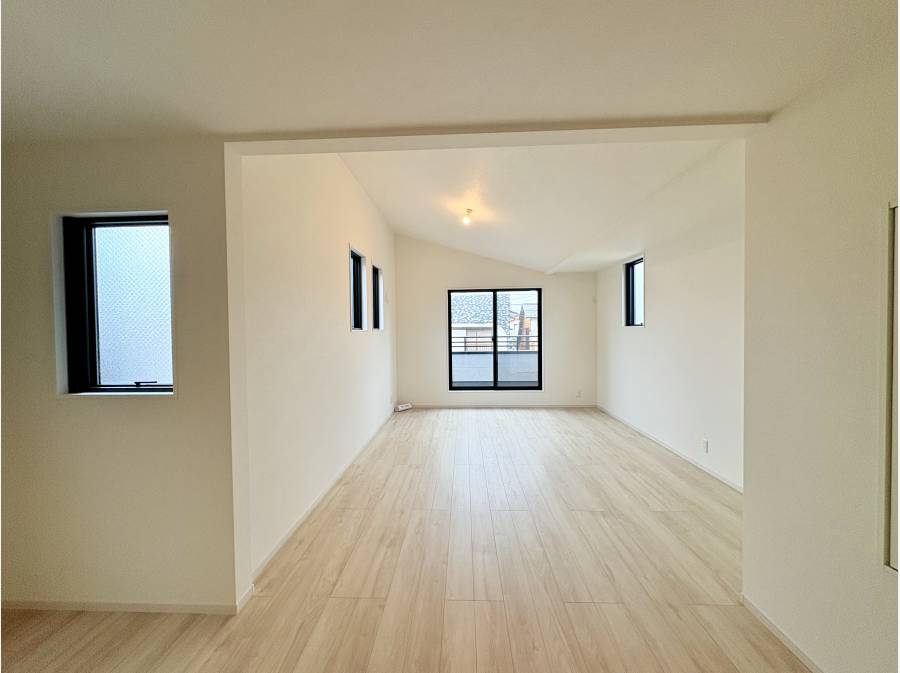 2階にあるLDKは21帖の広々空間。ご家族でまったりとした時間を過ごせる広さです。また勾配天井が開放的で落ち着きのある空間に仕上がっています。