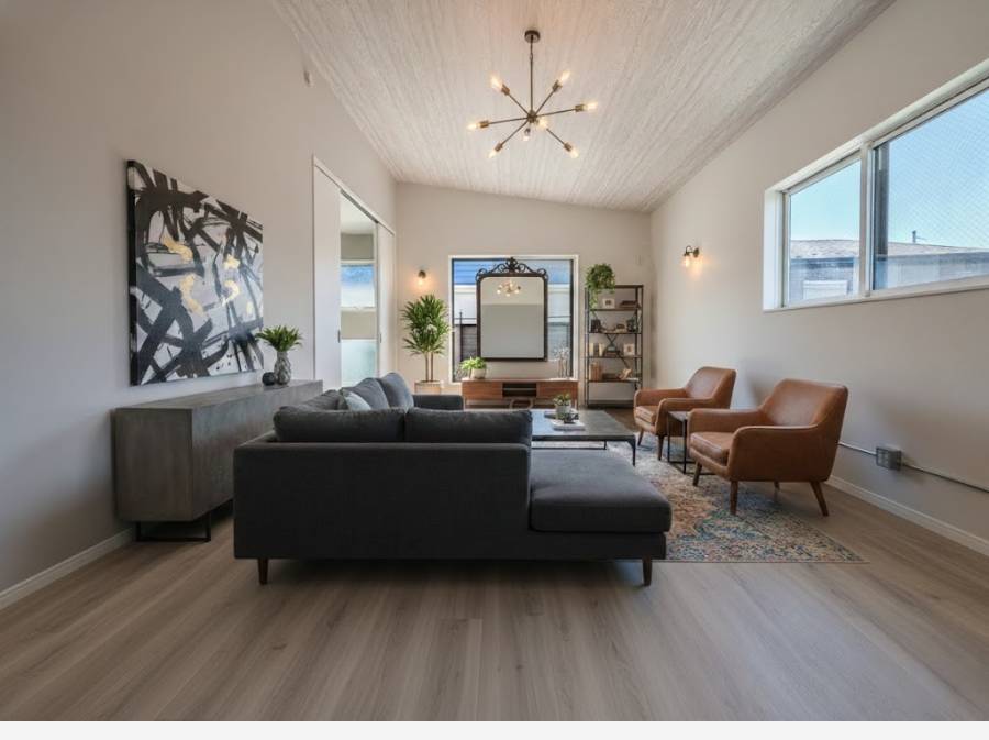 開放感ある勾配天井の約20帖のLDK(家具はイメージ)