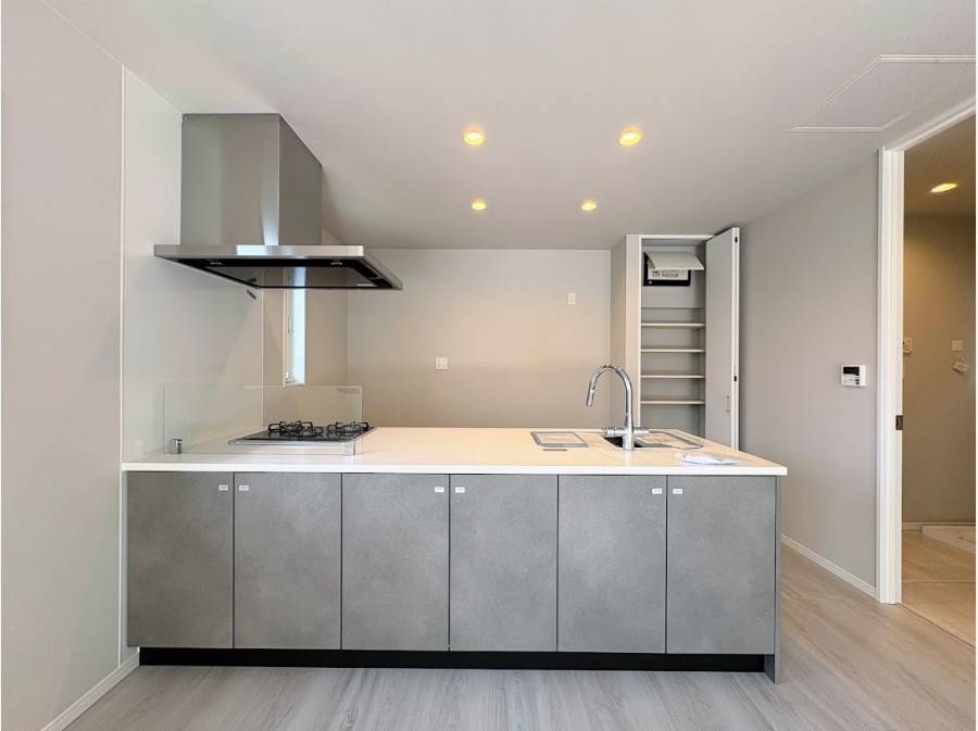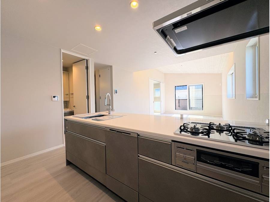 約20帖もの広々としたLDKは、勾配天井によってさらなる開放感を演出しました。キッチンには毎日のお料理が楽しくなるスタイリッシュなデザインを採用しています。