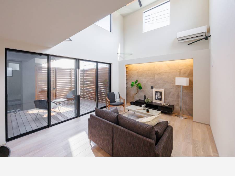 視線を巧みに遮りながら光と風を招き入れるデッキスペースは、完全なるプライベートパティオへと昇華。