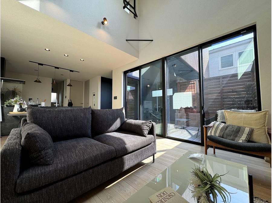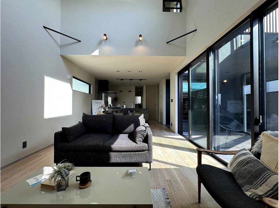 5mを超える吹抜LDKは、3面のFIX窓からやわらかな自然光を取り込み、時間とともに表情を変える空間を描き出してくれます。