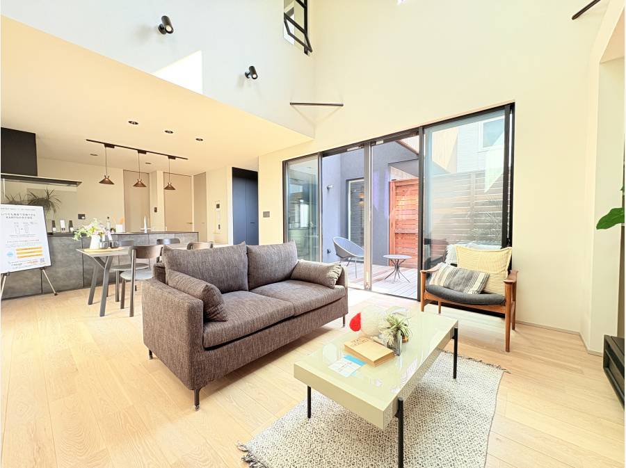 プライベート空間×開放感を追求したラグジュアリーな一邸。窓から自然光が注ぐ21帖の吹抜LDK
