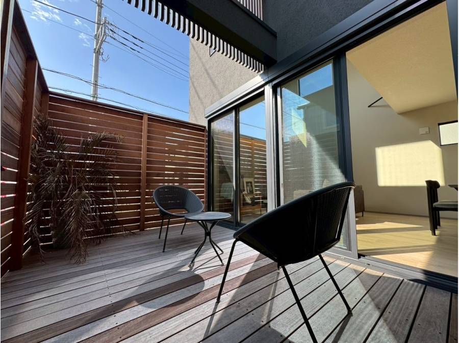外からの視線を遮る設計により、周囲を気にせず朝食や夕涼みを楽しめる、あなただけの「外のリビング」に。