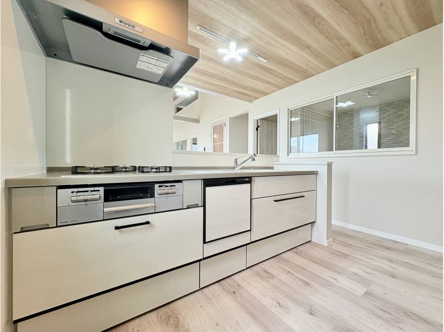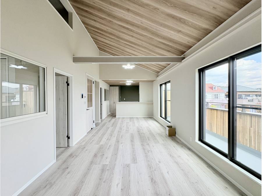 2階には約21帖のLDKが広がります。対面式のシステムキッチンに床暖房、住み良い設備が充実した住まいです。