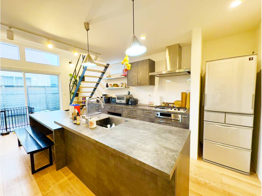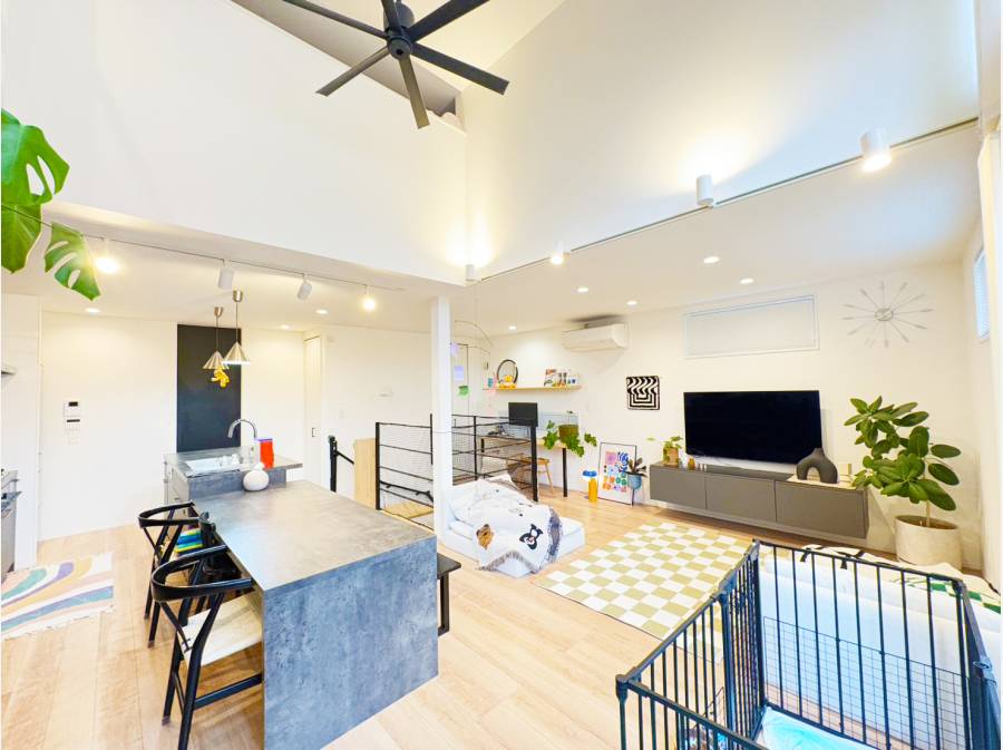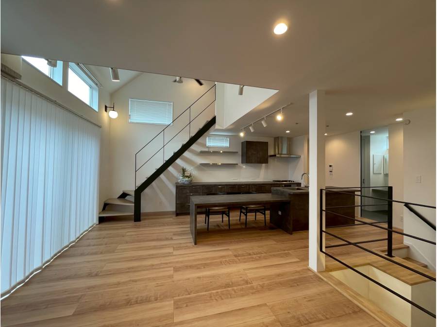 LDKは21帖超のゆとりある大空間。開放感あふれる吹き抜け仕様に加え、リビングにはアイアンのスケルトン階段を採用し、デザイン性の高い空間に仕上がっています。