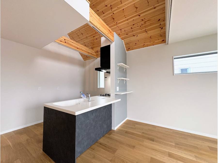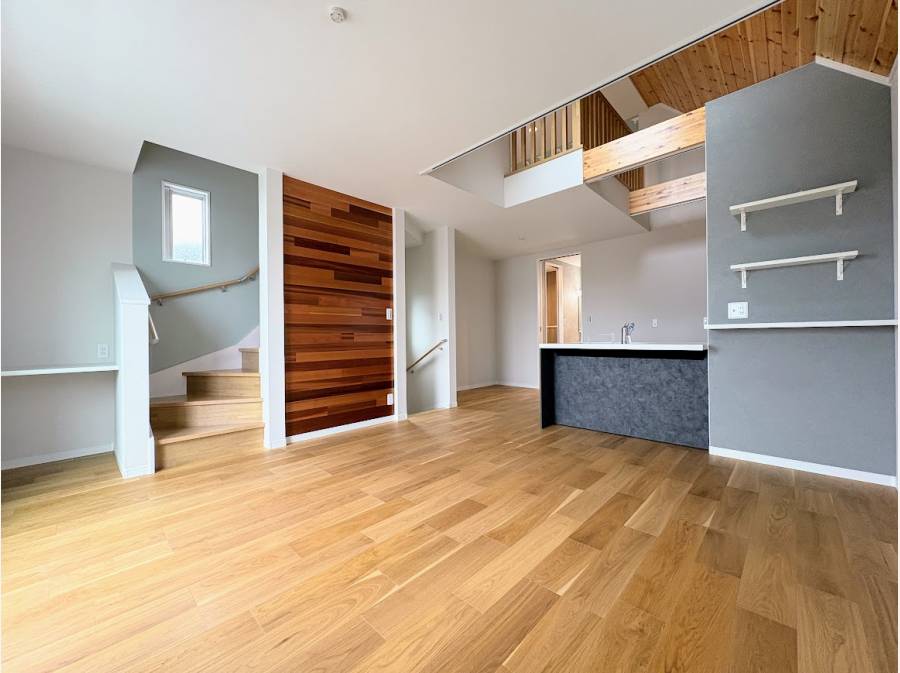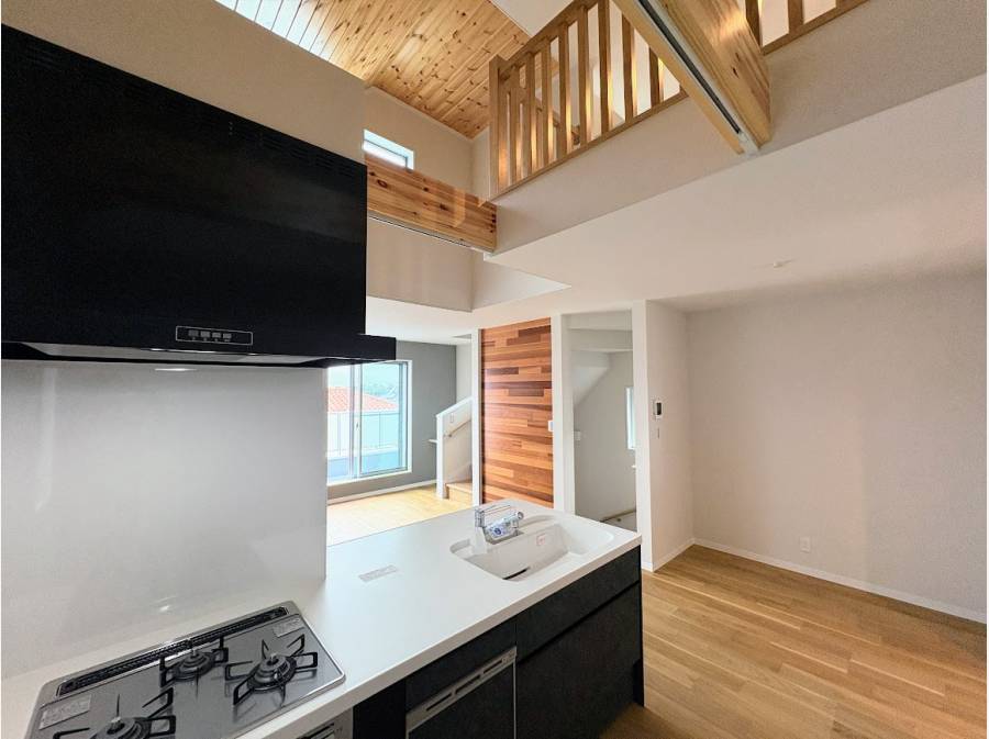 室内は、吹き抜け天井の広々としたLDKが中心。縦の広がりが開放感を演出し、明るくのびのびとした家族の空間となっています。さらに、収納や趣味のスペースとして多用途に使えるロフトスペースも完備。物件全体が、光と開放感にあふれる設計です。