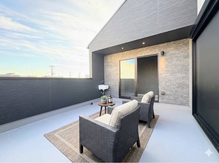 この物件の最大の魅力は、大型スカイバルコニーです。 青空の下、開放感あふれるこの空間は、まさにセカンドリビング。休日はご家族や友人を招いてBBQやアウトドアを楽しんだり、星空を眺めたりと、自由な発想で使いこなせるプライベートスペースです。