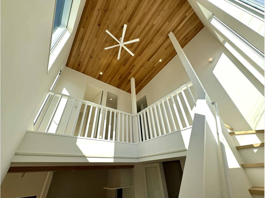 南東側の高窓から陽光が差し込み、明るく伸びやかな空間が広がります。