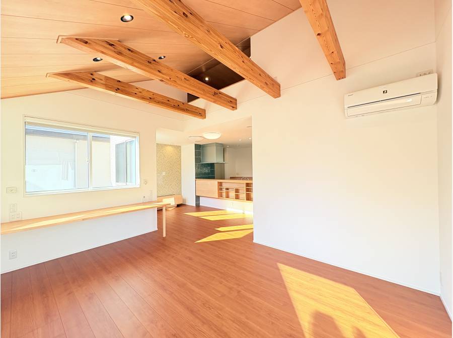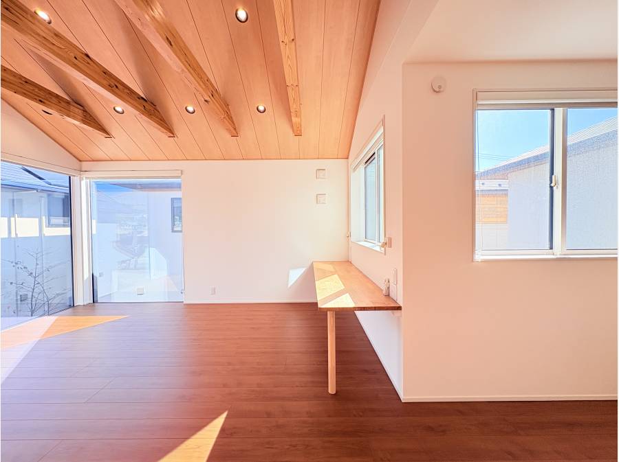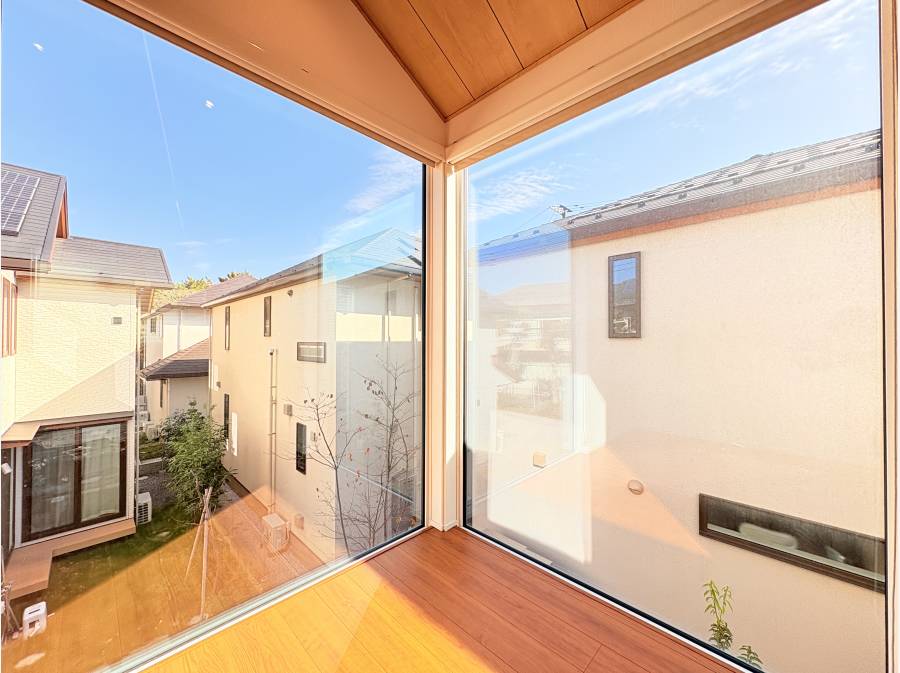 リビングの角に配置された大きな窓が、空間に明るさと開放感をもたらしてくれます。
